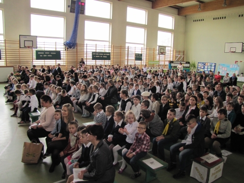Po mszy w uroczystym pochodzie przeszliśmy do szkoły. Wszyscy zgromadziliśmy się w odświętnie udekorowanej sali. Pani dyr. G. Wilkowska powitała wszystkich zgromadzonych, a następnie przybliżyła sylwetkę patrona, przedstawiła pracę wychowawczą szkoły, która nacechowana jest wartościami z życia patrona.