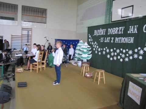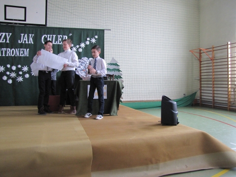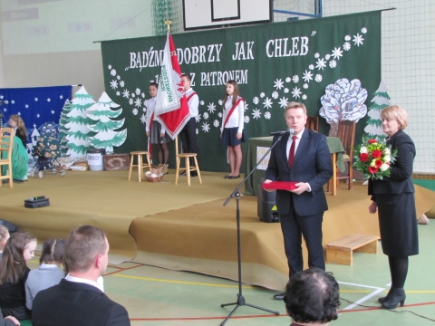 Następnie głos zabrali zaproszeni goście: starosta tucholski p. Michał Mróz, przewodniczącą Rady Powiatu p. M. Oller, wójt gminy p. D. Kożuch, dyr. Gimnazjum p. M. Pawelska i p. J. Piekarska z Jeżewa. Goście złożyli nam życzenia i przekazali upominki, za które serdecznie dziękujemy. Następnie uczniowie naszej szkoły pod opieką p. K. Król, L. Gornowicz, i p. R. Mechlińskiego przedstawili program okolicznościowy przybliżający sylwetkę patrona. Mottem części artystycznej było przesłanie „Bądźmy dobrzy jak chleb”.