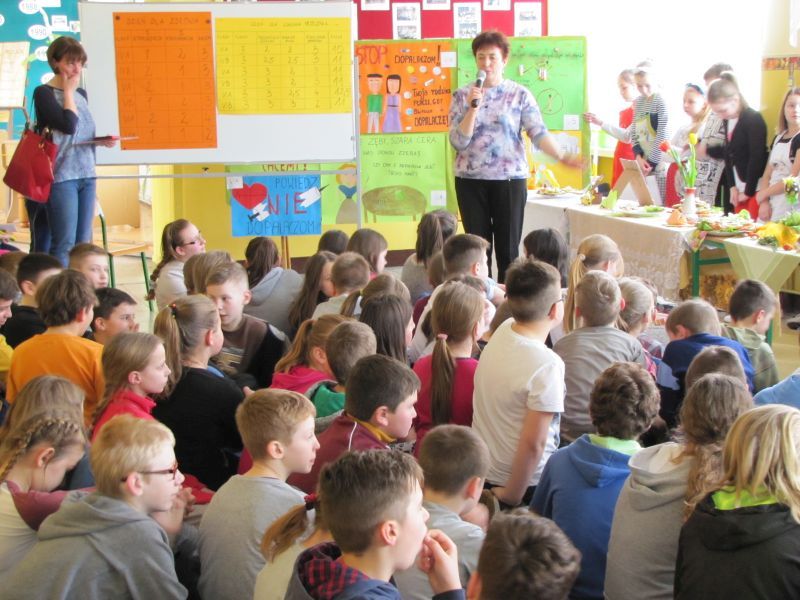 W ramach zadań konkursu wychowawczego uczniowie klas IV-VI rywalizowali najpierw zawodach sportowych na sali gimnastycznej. Następnym punktem programu była prezentacja zdrowego jedzenia w postaci pysznych, kolorowych kanapek wykonanych przez wyznaczonych uczniów przy pomocy rodziców. Ocenie jury podlegały też plakaty o treści profilaktycznej wykonane przez poszczególne klasy na godzinach wychowawczych.